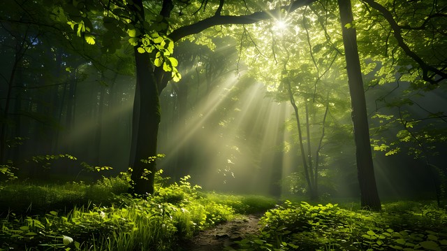 清晨阳光透过森林树叶描绘自然宁静与美丽的景象