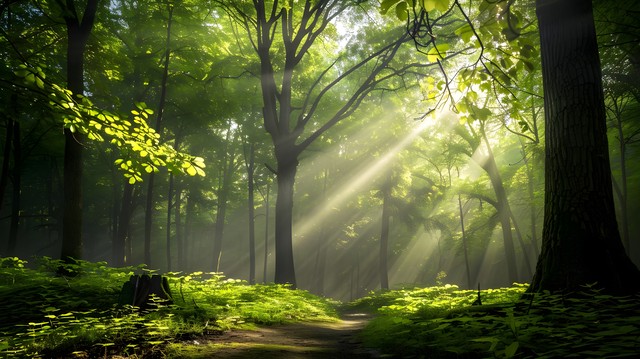 清晨阳光透过森林树叶描绘自然宁静与美丽的景象