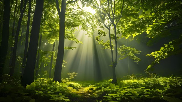 清晨阳光透过森林树叶描绘自然宁静与美丽的景象