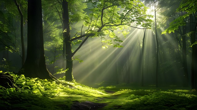 清晨阳光透过森林树叶描绘自然宁静与美丽的景象