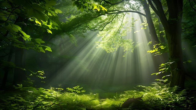 清晨阳光透过森林树叶描绘自然宁静与美丽的景象