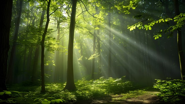 清晨阳光透过森林树叶描绘自然宁静与美丽的景象