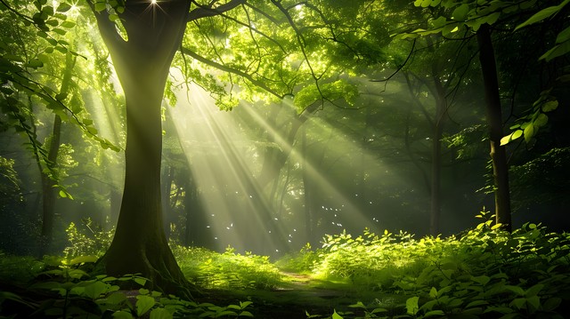 清晨阳光透过森林树叶描绘自然宁静与美丽的景象
