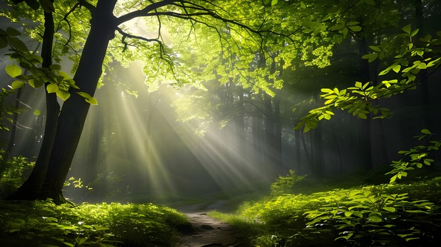 清晨阳光透过森林树叶描绘自然宁静与美丽的景象