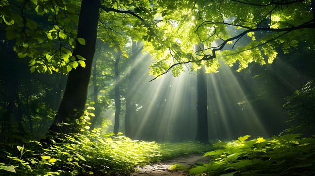 清晨阳光透过森林树叶描绘自然宁静与美丽的景象