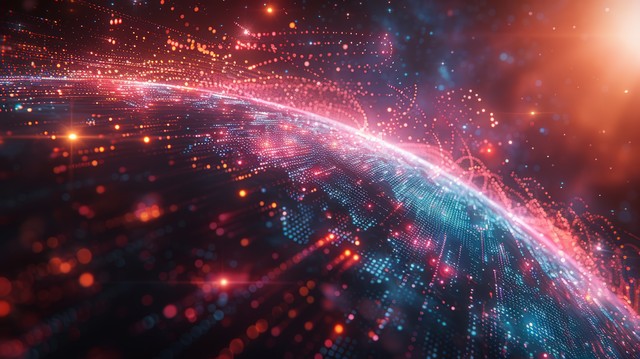 一个数据地球模型悬浮在虚拟空间中,表面流动着各种颜色的数据流
