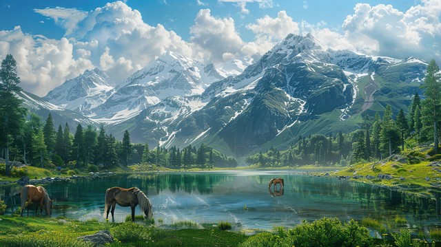 【AIGC】新疆阿勒泰自然风景,山和草原上的马