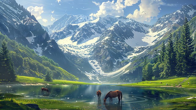 【AIGC】新疆阿勒泰自然风景,山和草原上的马