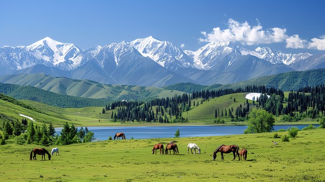 【AIGC】新疆阿勒泰自然风景,山和草原上的马