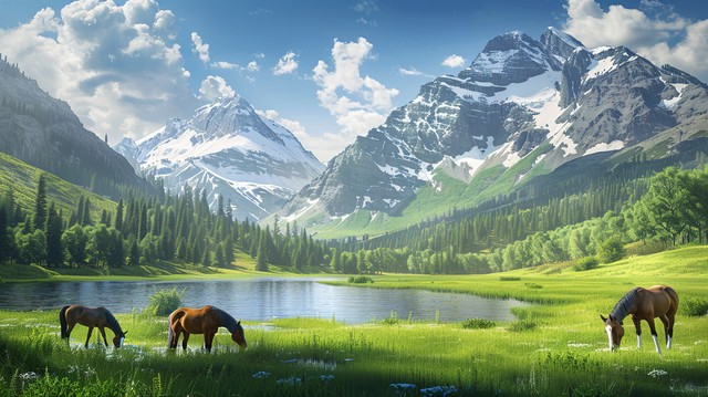 【AIGC】新疆阿勒泰自然风景,山和草原上的马