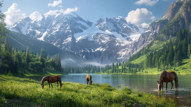 【AIGC】新疆阿勒泰自然风景,山和草原上的马