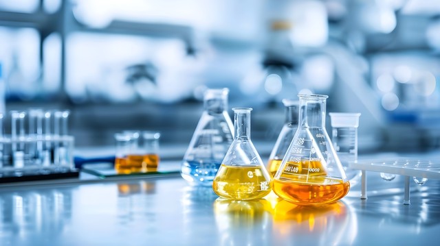 实验室中的烧瓶与化学溶液展现科学研究与实验