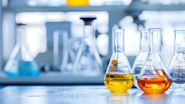 实验室中的烧瓶与化学溶液展现科学研究与实验