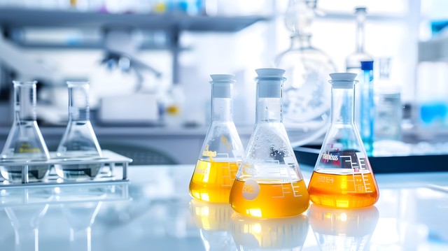 实验室中的烧瓶与化学溶液展现科学研究与实验