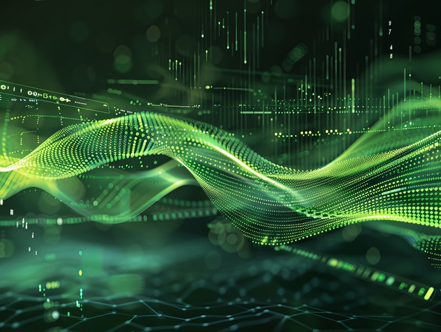 动态绿色波浪图案点缀着数字符号,环保绿色抽象背景