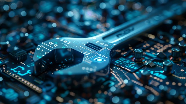 发光的数字扳手悬浮在电路板上,象征技术和维修。