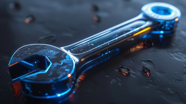 发光的数字扳手悬浮在电路板上,象征技术和维修。