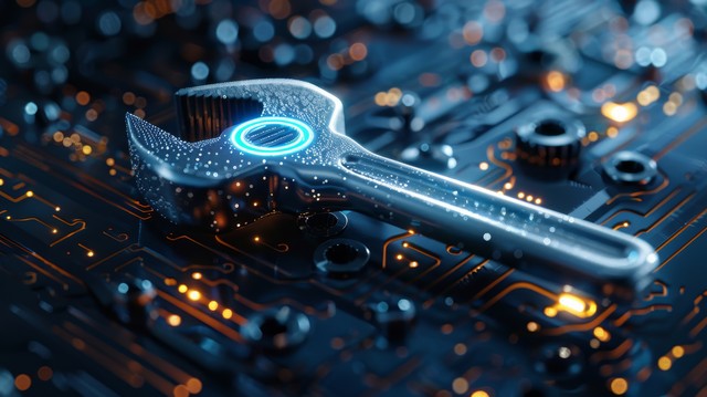 发光的数字扳手悬浮在电路板上,象征技术和维修。