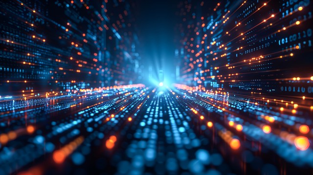 抽象发光的蓝色数字化科技,未来主义城市灯光和空中流动的数据,数字技术概念科学大数据风格数据流和信息流