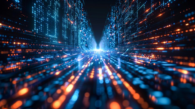 抽象发光的蓝色数字化科技,未来主义城市灯光和空中流动的数据,数字技术概念科学大数据风格数据流和信息流
