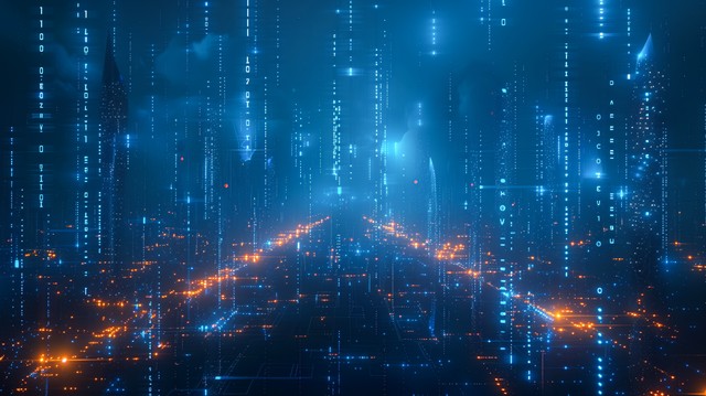 抽象发光的蓝色数字化科技,未来主义城市灯光空中流动数据符号,数字技术概念科学大数据风格数据流和信息流