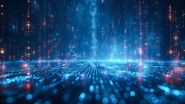 抽象发光的蓝色数字化科技,未来主义城市灯光空中流动数据符号,数字技术概念科学大数据风格数据流和信息流