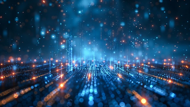 抽象发光的蓝色数字化科技,未来主义城市灯光空中流动数据符号,数字技术概念科学大数据风格数据流和信息流