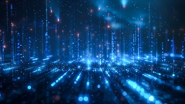 抽象发光的蓝色数字化科技,未来主义城市灯光空中流动数据符号,数字技术概念科学大数据风格数据流和信息流