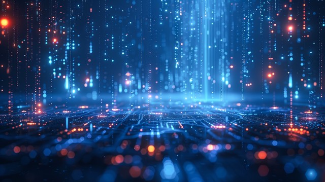 抽象发光的蓝色数字化科技,未来主义城市灯光和空中流动的数据,数字技术概念科学大数据风格数据流和信息流