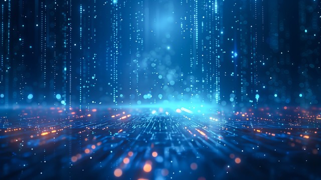抽象发光的蓝色数字化科技,未来主义城市灯光和空中流动的数据,数字技术概念科学大数据风格数据流和信息流