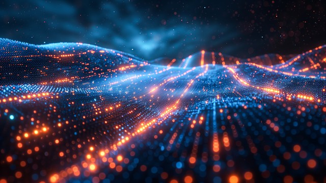 抽象发光的蓝色数字化科技,未来主义城市灯光和空中流动的数据,数字技术概念科学大数据风格数据流和信息流