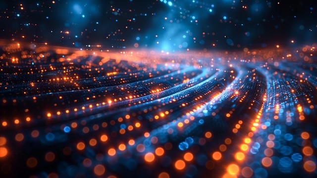 抽象发光的蓝色数字化科技,未来主义城市灯光和空中流动的数据,数字技术概念科学大数据风格数据流和信息流