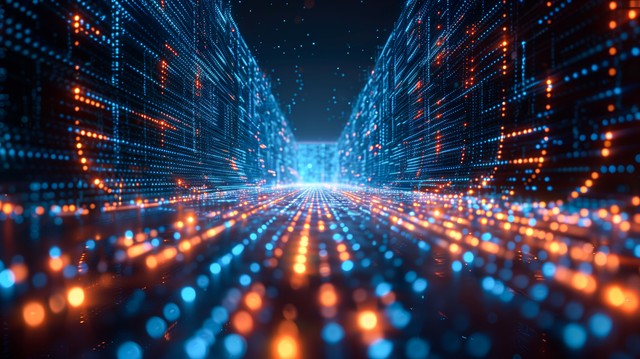 抽象发光的蓝色数字化科技,未来主义城市灯光和空中流动的数据,数字技术概念科学大数据风格数据流和信息流