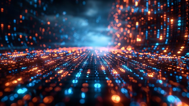 抽象发光的蓝色数字化科技,未来主义城市灯光和空中流动的数据,数字技术概念科学大数据风格数据流和信息流