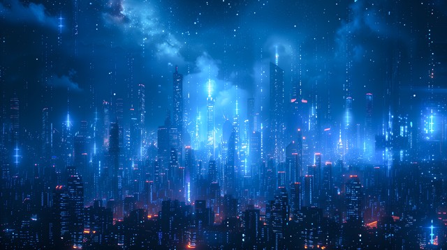 抽象发光的蓝色数字化科技,未来主义城市灯光和空中流动的数据,数字技术概念科学大数据风格数据流和信息流