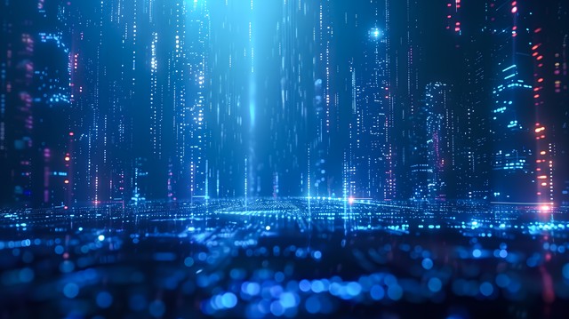 抽象发光的蓝色数字化科技,未来主义城市灯光和空中流动的数据,数字技术概念科学大数据风格数据流和信息流