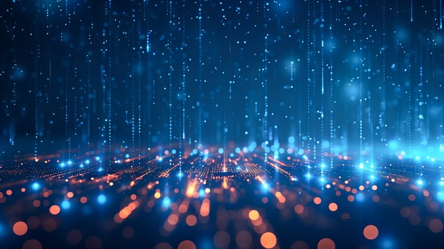 抽象发光的蓝色数字化科技,未来主义城市灯光和空中流动的数据,数字技术概念科学大数据风格数据流和信息流