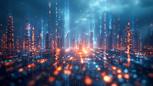 抽象发光的蓝色数字化科技,未来主义城市灯光和空中流动的数据,数字技术概念科学大数据风格数据流和信息流
