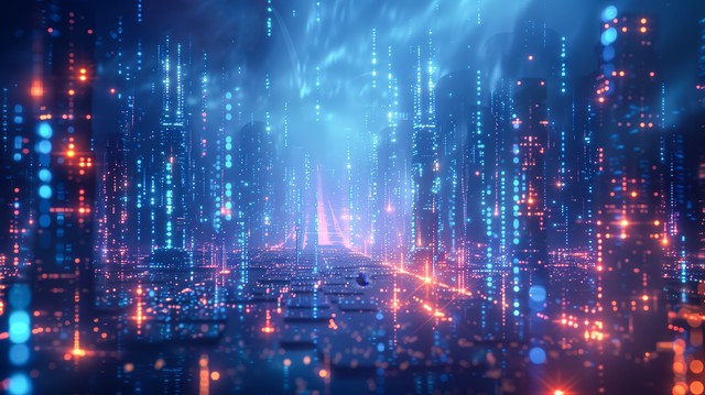 抽象发光的蓝色数字化科技,未来主义城市灯光和空中流动的数据,数字技术概念科学大数据风格数据流和信息流