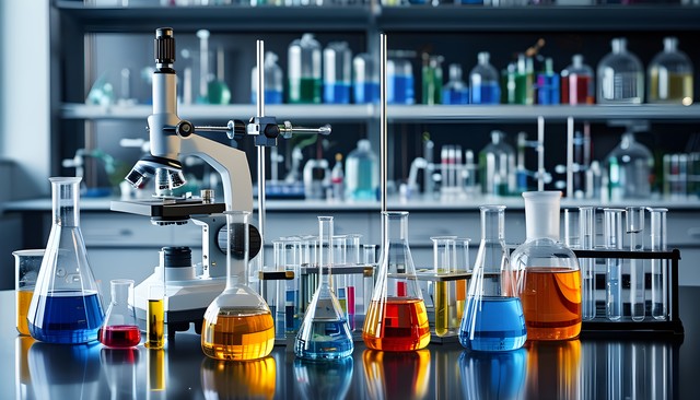 实验室瓶瓶罐罐中五颜六色的液体