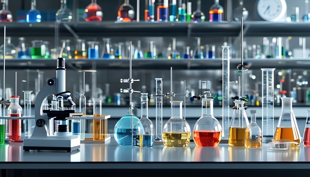 实验室瓶瓶罐罐中五颜六色的液体