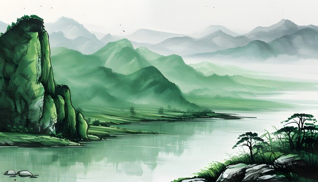 翠绿山水画,湖泊与远山相映成趣,展现自然的和谐美。