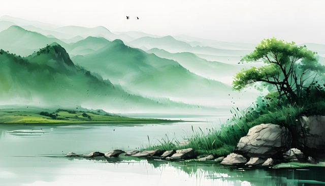 翠绿山水画,湖泊与远山相映成趣,展现自然的和谐美。