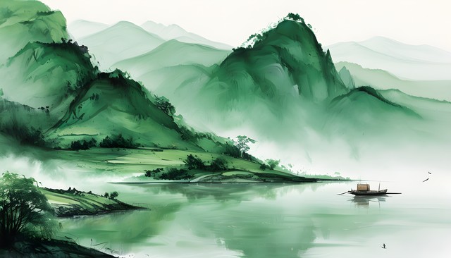 翠绿山水画,湖泊与远山相映成趣,展现自然的和谐美。