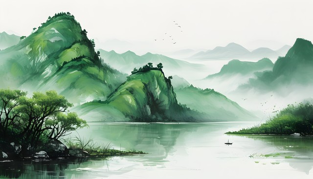 翠绿山水画,湖泊与远山相映成趣,展现自然的和谐美。