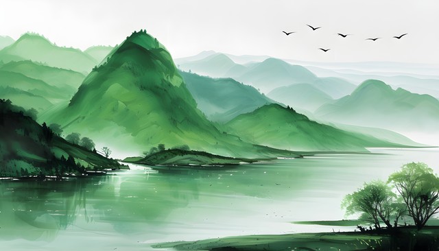 翠绿山水画,湖泊与远山相映成趣,展现自然的和谐美。