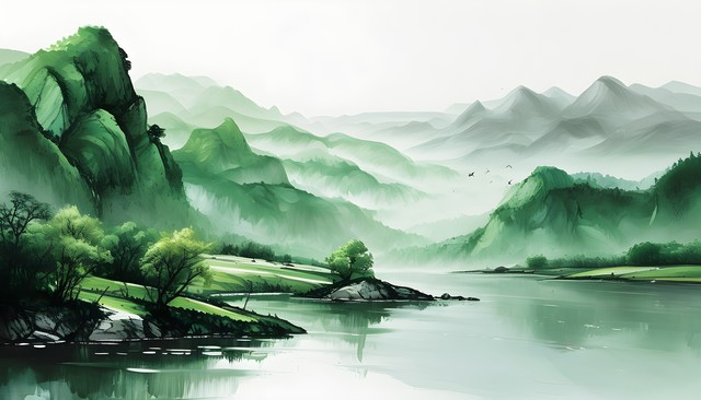 翠绿山水画,湖泊与远山相映成趣,展现自然的和谐美。