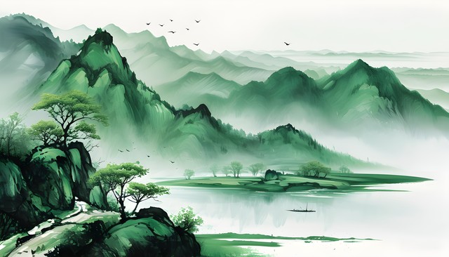 翠绿山水画,湖泊与远山相映成趣,展现自然的和谐美。