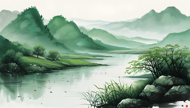 翠绿山水画,湖泊与远山相映成趣,展现自然的和谐美。