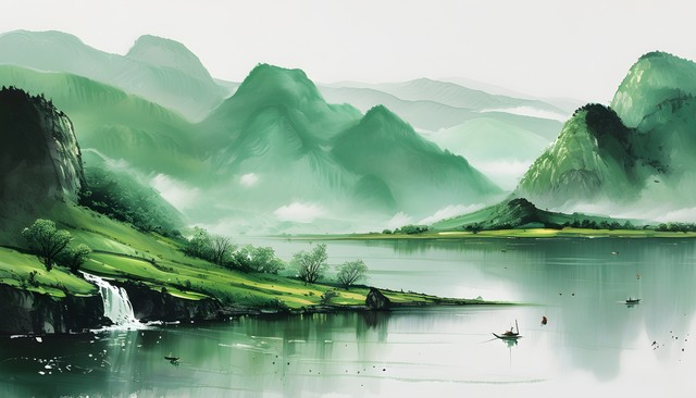 翠绿山水画,湖泊与远山相映成趣,展现自然的和谐美。